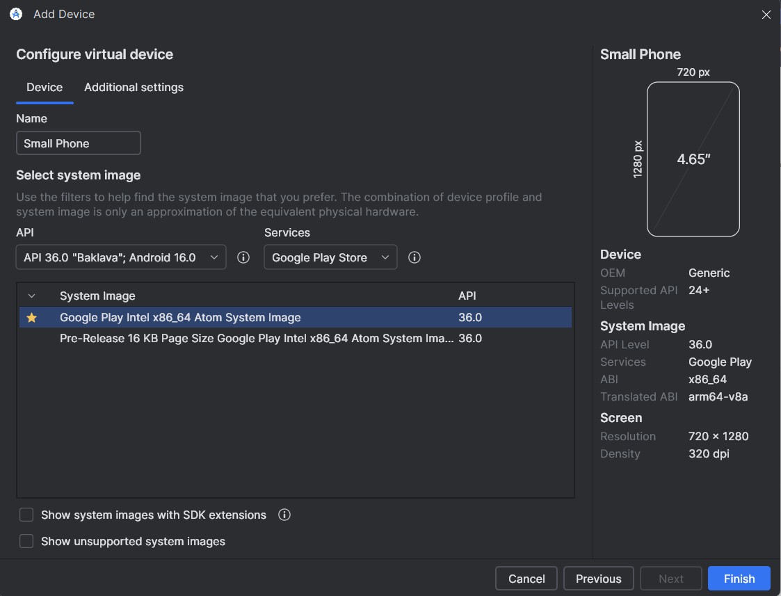 5. Choose the x86_64 image with Google APIs for better compatibility.