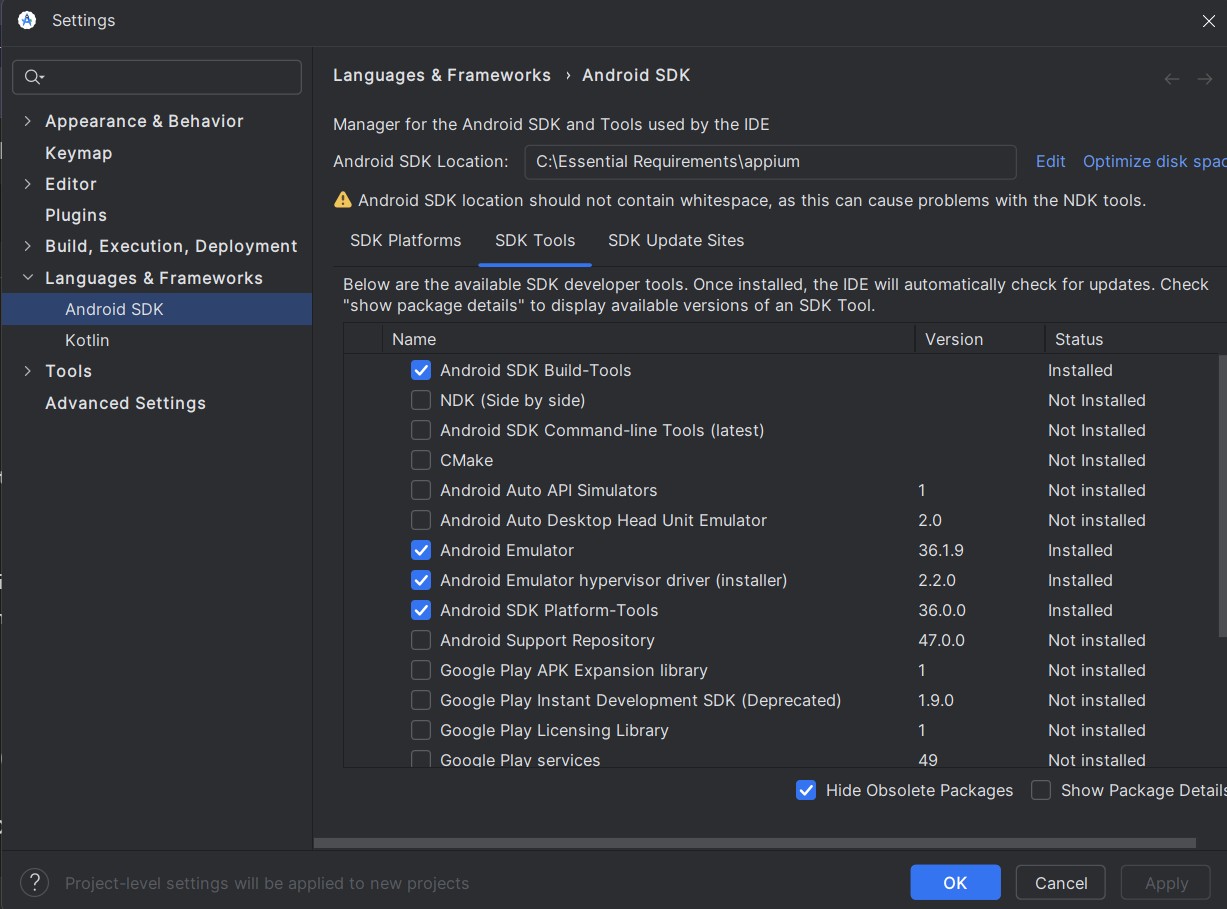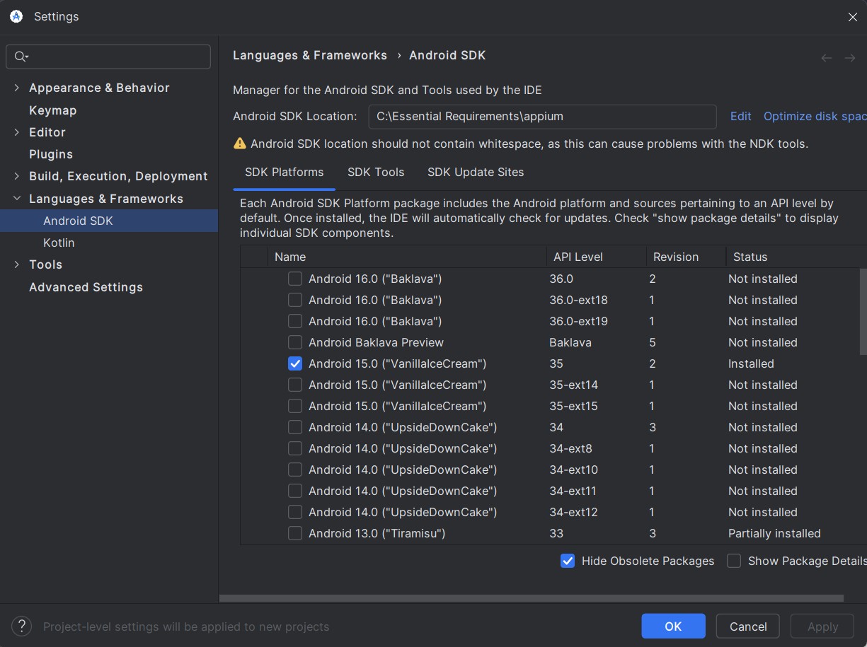 3. In SDK Platforms tab, Select required Android verision for testing.