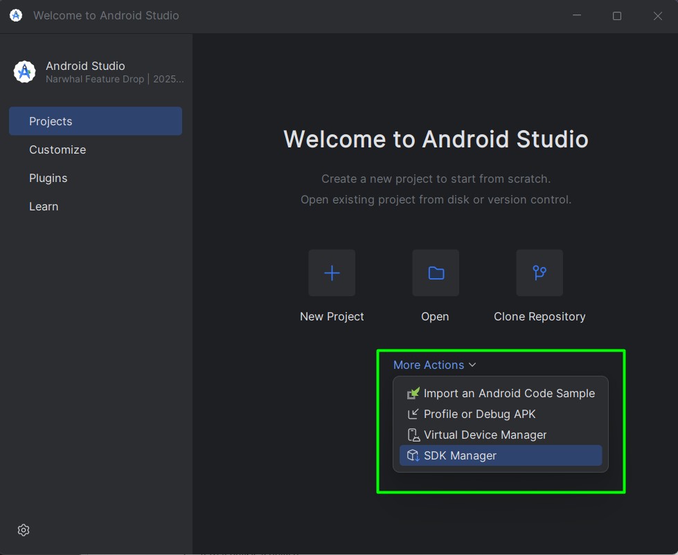 2. Go to Welcome Screen → More Actions → SDK Manager