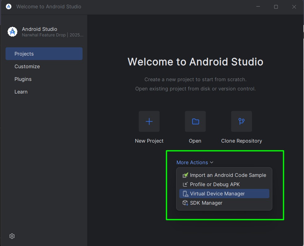 1. In the Android Studio Home page, click More Actions > Virtual Device Manager.