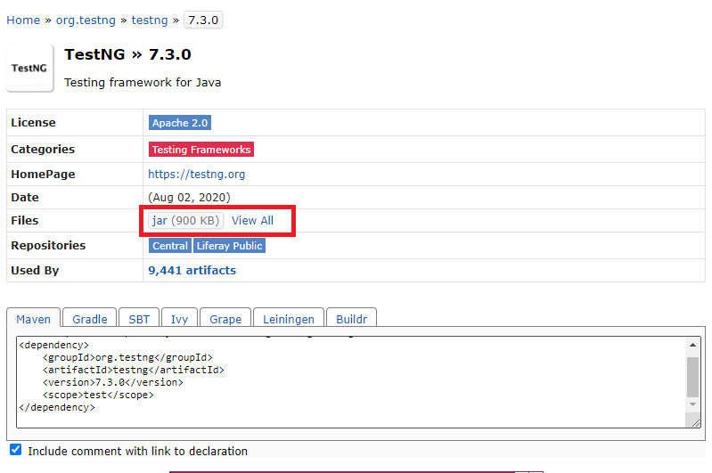 Step 1:To download the TestNG jar file go to the web site https://mvnrepository.com/artifact/org.testng/testng and select the latest version of TestNG
