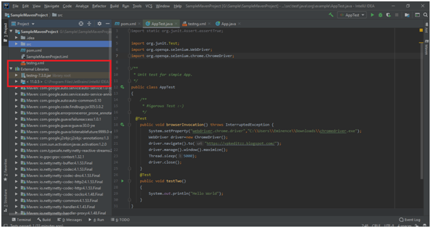 Step 9:To verify TestNG is installed in your project, Just expand the “External Libraries” from the left sidebar and there you can see your TestNG JAR file like below