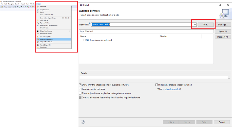 Step 2:You will get the below the window when click the Install New Software option. In that window, click Add button