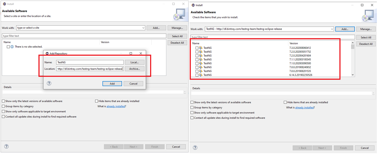 Step 3:When click add button you will get the below screen, In that enter Name as “TestNG” and enter http://dl.bintray.com/testng-team/testng-eclipse-release URL in the Location field and then click Add button