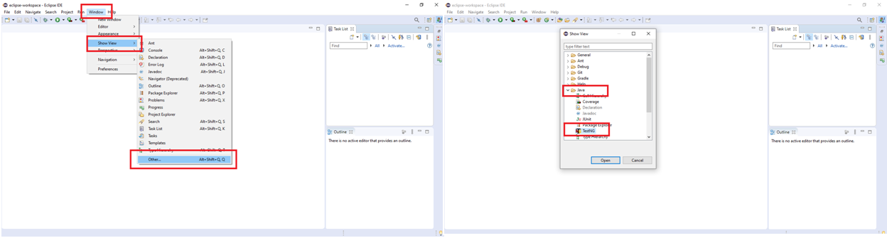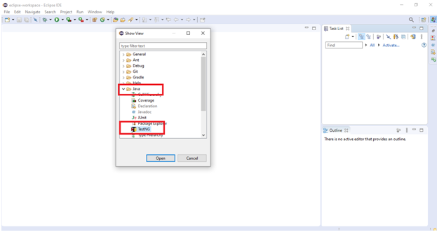 Step 9:The application will be opened with an updated plug-in including TestNG. To verify that click Help-> Show View -> Other