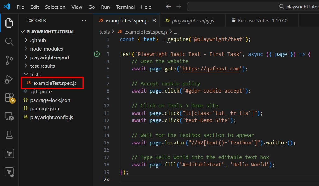 In the upcoming sections, we will learn about Playwright locators in detail. For now, let’s see how a basic Playwright test looks.
