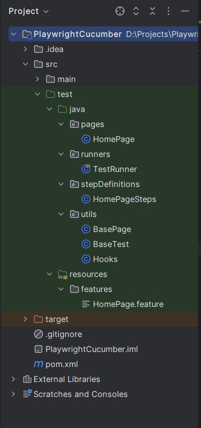 This setup results in a clean and scalable Playwright + Java + Cucumber BDD framework that follows the Page Object Model, improving test readability, reusability, and maintainability.