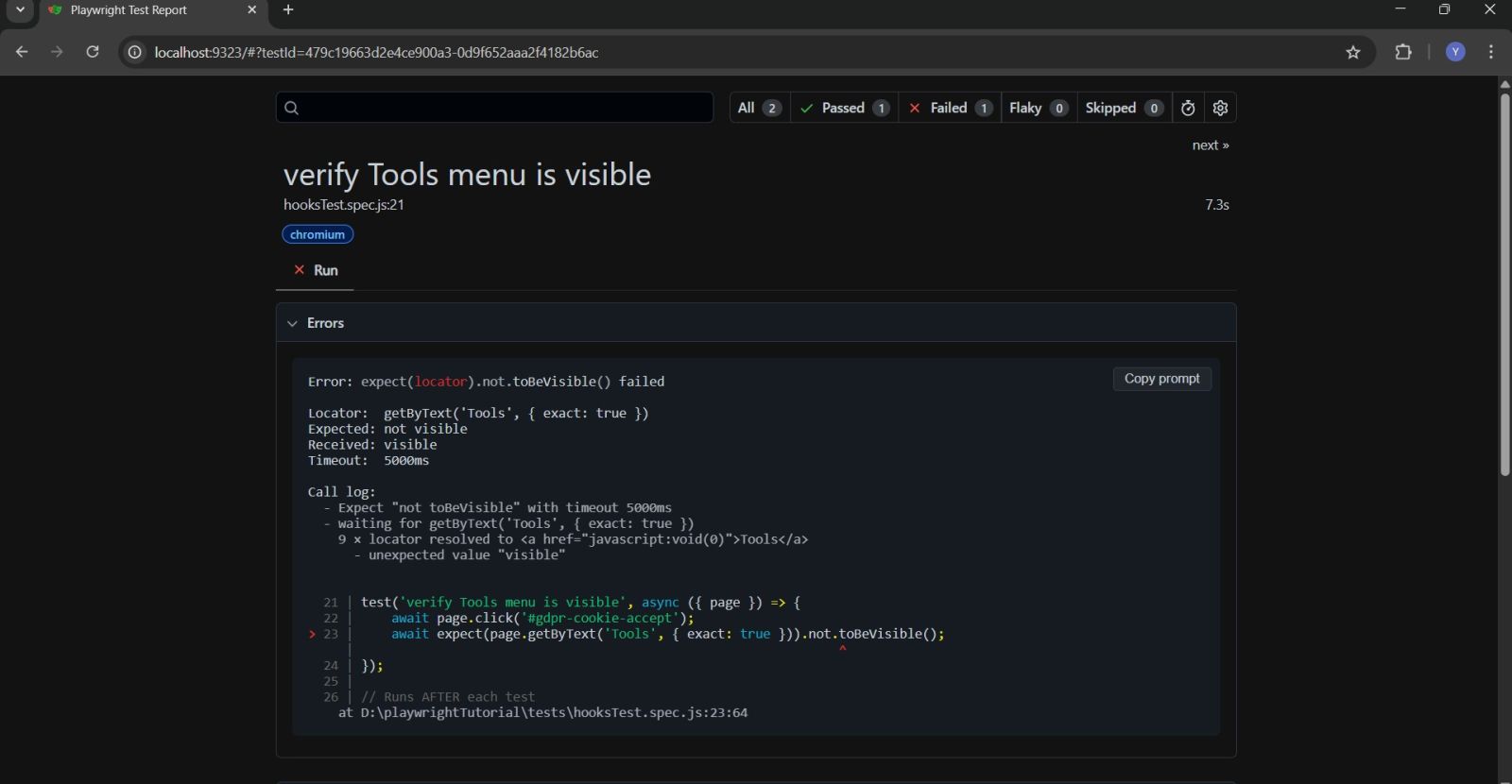 After running the tests, if a test fails, the HTML report opens in the browser automatically. When the test gets passed, you can execute the following command: npx playwright show-report, this command opens the HTML report in your default browser.