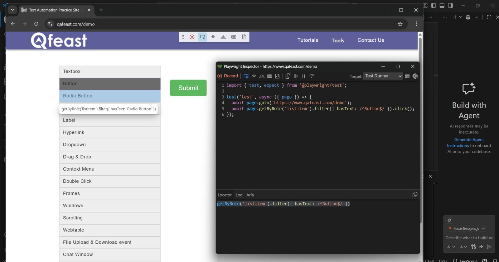 - A Playwright Inspector window, which shows the Playwright code being generated in real time